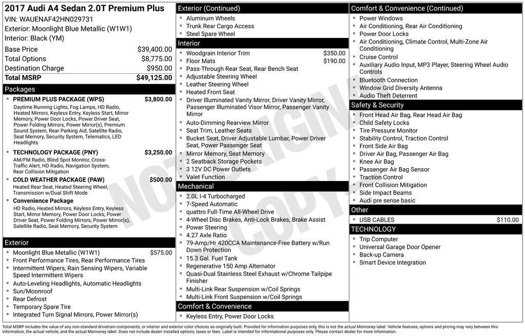 2017 Audi A4 2.0T Premium Plus in Moonlight Blue vehicle highlights include.., CLEAN CAR FAX, SUPER LOW MILES, AWD, quattro, NAVIGATION, SUNROOF, ACTIVE PARK ASSIST, BACK UP CAM / REAR VIEW CAMERA, TRI-ZONE CLIMATE CONTROL, PREMIUM INTERIOR, HEATED STEERING WHEEL, DAY TIME RUNNING LAMPS, RAIN SENSING WIPERS, PADDLE SHIFTER, FRONT & REAR USB, SIRIUS XM*, HOMELINK, Bluetooth®, B & O PREMIUM AUDIO, MIRRORS/HEATED/AUTOFOLD/SIGNAL/DRIVER MEMORY/AUTO DIMMING/APPROACH LIGHTS, QUALITY, PREMIUM LEATHER TRIMMED SEATING, MEMORY DRIVER SEAT, POWER SEATS, SPORT SEATS, HEATED SEATS, HEATED 2ND ROW, LATCH* CHILD SAFETY SYSTEM, LED AUTOMATIC HIGH/LOW BEAMS, LED TAIL LIGHTS, T.P.M.S., ALL WEATHER FLOOR LINERS, UNIVERSAL GARAGE REMOTE, SURROUND SOUND, PARKING SYSTEM PLUS, S LINE EXTERRIOR, A4 2.0T Premium Plus quattro S tronic, 2.0L I4 TFSI DOHC, 7-Speed Automatic S tronic, 8-Way Power Front Seats w/Driver Memory, ABS brakes, Alloy wheels, Aluminum High-Gloss Window Surrounds, Anti-Theft Alarm System w/Immobilizer, Audi Advanced Key, Audi Connect CARE, Audi Connect PRIME & PLUS, Audi Guard All-Weather Floor Mats, Audi Pre Sense Rear, Audi Side Assist, Audi Virtual Cockpit, Auto-dimming Rear-View mirror, Automatic temperature control, Bang & Olufsen Sound System w/3D Sound, Brake assist, CD player, Cold Weather Package, Compass, Convenience Package, Delay-off headlights, Driver vanity mirror, Electronic Stability Control, Exterior Parking Camera Rear, Four wheel independent suspension, Front anti-roll bar, Front Center Armrest, Front dual zone A/C, Front fog lights, Front reading lights, Full LED Headlights, Garage door transmitter: HomeLink, Heated 3-Spoke Steering Wheel, Heated Auto-Dimming Power Exterior Mirrors w/Memory, Heated Front Seats, Heated Rear Seats, High intensity discharge headlights: Xenon plus, Illuminated entry, Leather Seating Surfaces, Low tire pressure warning, Natural Gray Oak Inlays, Outside temperature display, Overhead console, Parking System Plus, Passenger vanity mirror, Power Front Bucket Seats, Power moonroof, Power windows, Premium Plus Package, Radio data system, Radio: Audi MMI Navigation Plus w/MMI Touch, Radio: Audi Sound System, Rain sensing wipers, Rear air conditioning, Rear anti-roll bar, Rear fog lights, Rear reading lights, Rear seat center armrest, Rear window defroster, Remote keyless entry, SiriusXM Satellite Radio, Speed control, Speed-sensing steering, Speed-Sensitive Wipers, Split folding rear seat, Steering wheel mounted audio controls, Tachometer, Technology Package, Telescoping steering wheel, Tilt steering wheel, Traction control, Trip computer, Turn signal indicator mirrors, USB Cables, Variably intermittent wipers, Wheels: 7.5 x 17 5-Parallel Spoke Design, Wheels: 8 x 18 5-Spoke Dynamic Design.