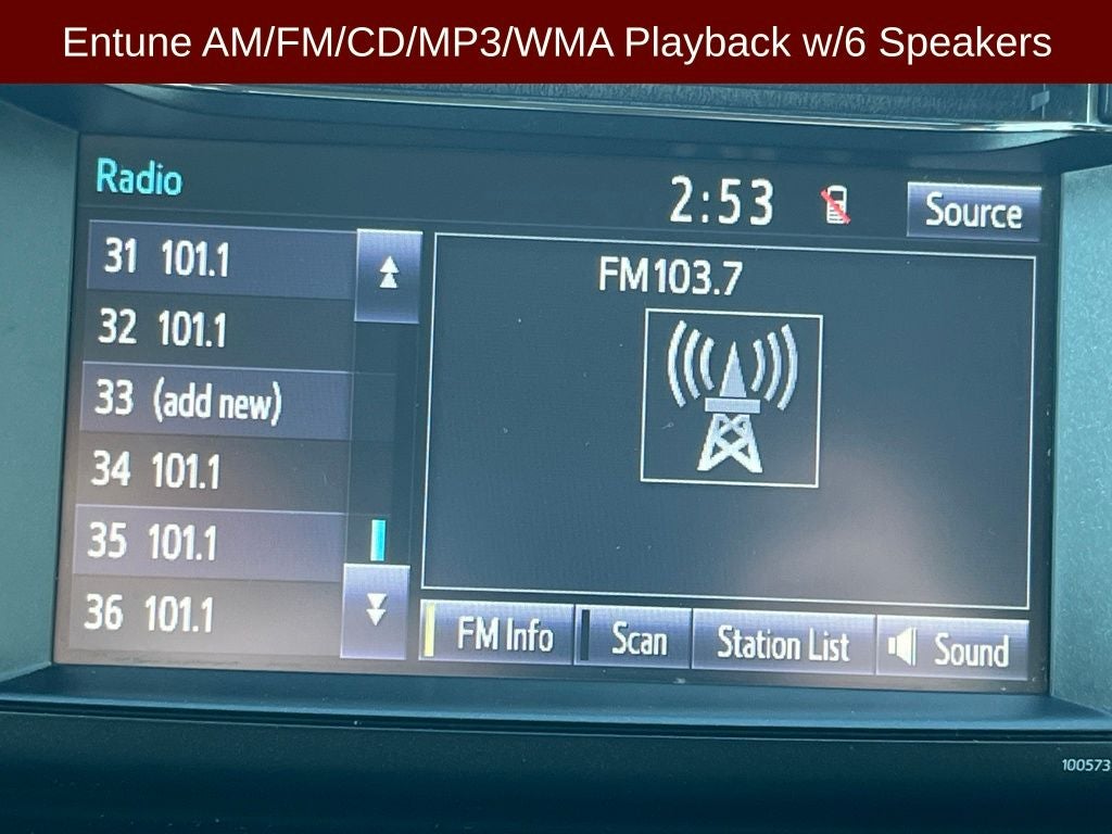 - Radio: Entune AM/FM/CD/MP3/WMA Playback w/6 Speakers -inc: 6.1" touch-screen w/integrated back-up camera display, auxiliary audio jack, USB port w/iPod connectivity and control, vehicle information w/customizable settings, hands-free phone capability, phone book access and music streaming via Bluetooth wireless technology