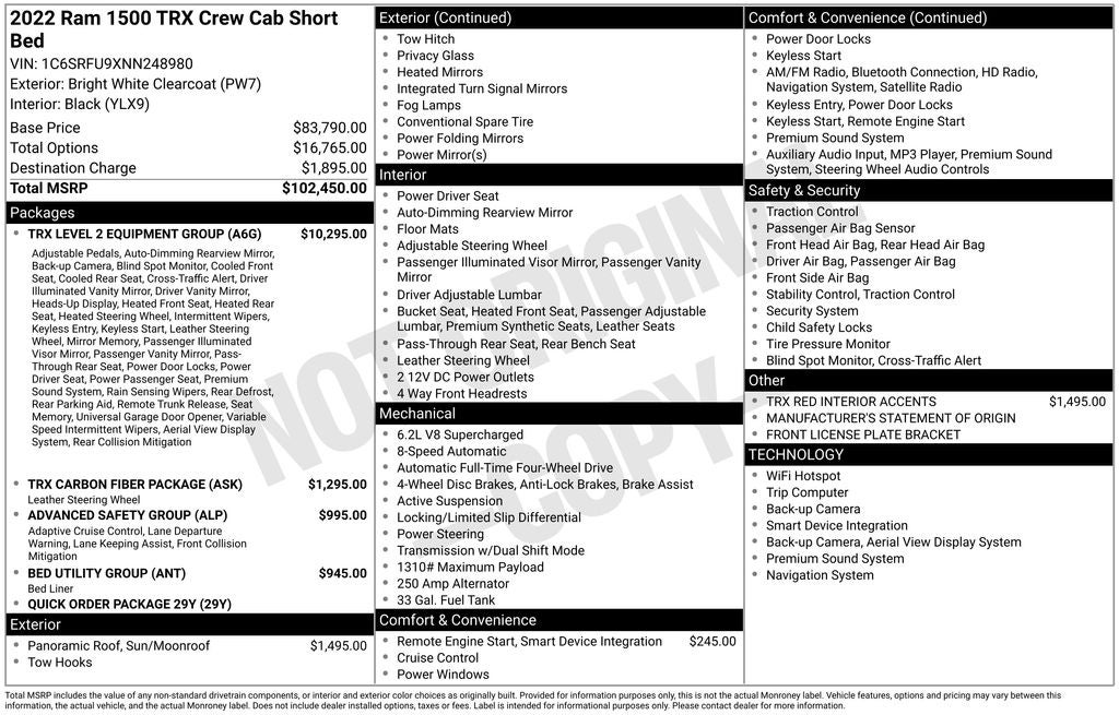 2022 Ram 1500 TRX in Bright White Clearcoat vehicle highlights include.., CERTIFIED READY, CLEAN CAR FAX, ACCIDENT FREE, 4WD, DUAL PANE PANORAMIC SUNROOF, BLIS W/CROSS-PATH PROTECTION, PARKSENSE FRONT & REAR PARK ASSIST, PARKVIEW BACK UP CAMERA, DIGITAL REAR-VIEW MIRROR, FULL SPEED FORWARD COLLISION BRAKING, PEDESTRIAN WARNING, ADVANCED BRAKE ASSIST, H.U.D. HEADS UP DISPLAY, LANE KEEPING, REMOTE START, INTELLIGENT ACCESS W/PUSH BUTTON START, REMOTE KEYLESS ENTRY, ILLUMINATED ENTRY, AUTOMATIC, FLAT BOTTOM SPORT STEERING WHEEL, HEATED STEERING WHEEL, POWERED ADJUSTABLE PEDALS w/MEMORY, RAIN SENSING WIPERS, PADDLE SHIFTER, CONFIGURABLE DRIVE MODES, DUAL WIRELESS CHARGING STATION, 5G WIFI MODEM, WIFI HOT SPOT, HD RADIO, Bluetooth®, AUXILLARY INPUT, MEDIA HUB, 12. PREMIUM TOUCH SCREEN, HARMAN KARDAN PREMIUM AUDIO, CARGO TIE DOWN HOOKS BY MOPAR, DEPLOYABLE BED STEP BY MOPAR, LED AMBIENT INTERIOR LIGHTING, CLASS lV TRAILER HITCH, INTEGRATED TRAILER BRAKE, POWER SLIDING REAR WINDOW, SPRAY-IN BEDLINER BY MOPAR*, LED BED LIGHTING, POWER TAILGATE RELEASE, QUALITY, PREMIUM LEATHER TRIMMED SEATING, MEMORY DRIVER SEAT, POWER SEATS, SPORT SEATS, HEATED & COOLED FRONT SEATS, VENTILATED SEATS, HEATED 2ND ROW, VENTILATED REAR SEATS, CLEAN AIR SYSTEM, FRONT & REAR RUBBER MATS BY MOPAR, *PERFORMANCE BRAKES, 6.2L Supercharged HEMI V8 SRT, 8-Speed Automatic, #2 Seat Foam Cushion, 10 Speakers, 2-Door Passive Entry, Front Door Locks, 3.55 Rear Axle Ratio, 4 Way Front Headrests, 4-Wheel Disc Brakes, ABS brakes, Adaptive Cruise Control w/Stop & Go, Adaptive suspension, Advanced Safety Group, Alloy wheels, AM/FM radio: SiriusXM with 360L, Apple CarPlay/Android Auto, Auto High-beam Headlights, Auto-dimming door mirrors, Auto-dimming Rear-View mirror, Automatic temperature control, Bed Utility Group, Black Exterior Mirrors, Blind Spot & Cross Path Detection, Body Color Door Handles, Brake assist, Bucket Seats, Center Console Parts Module, Cloth/Vinyl Bucket Seats, Compass, Delay-off headlights, Digital Rearview Mirror, Dome Dual LED Reading Lamp, Driver door bin, Driver Seat Memory, Driver/Passenger Wrapped Assist Handles, Electronic Stability Control, Exterior Mirrors Courtesy Lamps, Exterior Mirrors w/Heating Element, Exterior Mirrors w/Memory, Exterior Mirrors w/Supplemental Signals, Front anti-roll bar, Front Bucket Seats, Front Center Armrest w/Storage, Front Door Accent Lighting, Front dual zone A/C, Front fog lights, Front License Plate Bracket, Front reading lights, Front Seat Back Map Pockets, Front wheel independent suspension, Full Length Premium Upgraded Floor Console, Fully automatic headlights, harman/kardon 19 Speaker Premium Sound, Heads-Up Display, Heated door mirrors, Heated Front Seats, Heated Second Row Seats, Heated Steering Wheel, Illuminated entry, IP LED Ambient Light Pipe, Lane Keep Assist, Leather Shift Knob, Leather steering wheel, Leather Trimmed Bucket Seats, Leather/Carbon Flat-Bottom Steering Wheel, Leather/Suede Flat-Bottom Steering Wheel, LED CHMSL Lamp, Low tire pressure warning, Luxury Front Door Trim Panel, Manufacturer's Statement of Origin, MOPAR 4 Adjustable Cargo Tie-Down Hooks, MOPAR Bright Pedal Kit, MOPAR Deployable Bed Step, MOPAR Spray In Bedliner, Outside temperature display, Overhead console, Panic alarm, ParkSense Front/Rear Park Assist w/Stop, ParkView Rear Back-Up Camera, Passenger vanity mirror, Pedestrian Emergency Braking, Pick-Up Box Lighting, Power 4-Way Driver Lumbar Adjust, Power 4-Way Passenger Lumbar Adjust, Power 8-Way Driver & Passenger Seats, Power Adjustable Pedals w/Memory, Power door mirrors, Power-Folding Mirrors, Premium Wrapped IP Bezel, Radio data system, Radio: Uconnect 5 Nav w/12.0 Display, Radio/Driver Seat/Mirrors/Pedals Memory, Rain Sensitive Windshield Wipers, Real Carbon Fiber Interior Accents, Rear 60/40 Folding Seat, Rear 60/40 Folding Split Recline Seat, Rear Door Accent Lighting, Rear seat center armrest, Rear step bumper, Rear